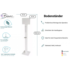 Der Bodenständer aus Edelstahl ist mit einer Infotafel und einer abnehmbaren Abtropfschale ausgestattet, jedoch ohne Spender. Auf Anfrage kann die Cosmos Montageplatte für den Cosmos Sensor Desinfektionsspender von Blanc Hygienic angebracht werden, während auch andere Spenderkompatibilität besteht. Dieser frei aufstellbare Ständer erweist sich als robuste Lösung, insbesondere in Fällen, in denen eine Wandmontage nicht umsetzbar ist. Dank der abnehmbaren Tropfschale gestaltet sich die Handhygiene problemlos. Darüber hinaus trägt der Ständer dazu bei, Kontaminationen entgegenzuwirken und die Hygiene in stark frequentierten Bereichen zu verbessern. Hergestellt aus Edelstahl, beeindruckt er mit Maßen von 330 x 1300 x 330 mm (BxHxT) oder 330 x 1403 x 330 mm (BxHxT) inklusive der Infotafel. Verfügbar in den Farbvarianten Edelstahl, Weiß und Anthrazit.