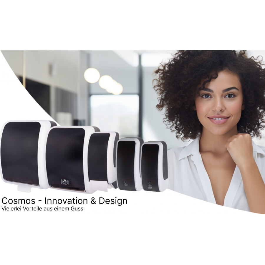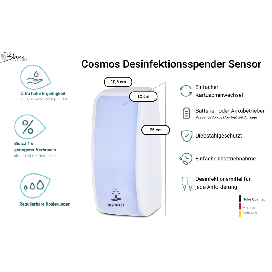 Der innovative Desinfektionsspender Blanc Cosmos Sensor - Made in Germany vereint Kostenersparnis, Nachhaltigkeit, technische Raffinesse, Benutzerfreundlichkeit, Flexibilität und ein formschönes Design.