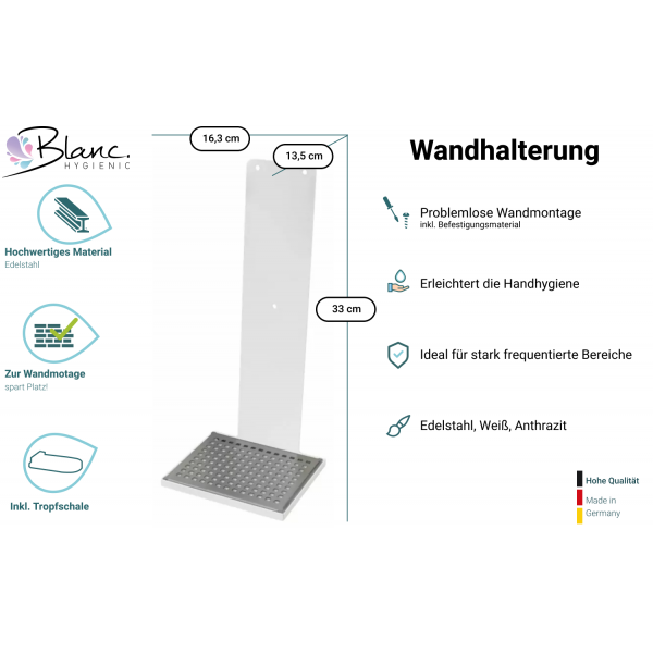 Der innovative Blanc Cosmos Desinfektionsspender Sensor (berührungslos) "Made in Germany" + 2 Kartuschen Blanc Haut- und Händedesinfektion Skindisinfect Liquid + Edelstahlhalterung mit Auffangschale.