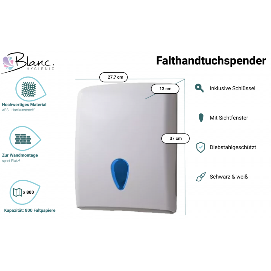 Der Falthandtuchspender Infinity von Blanc Hygienic ist die ideale, kompakte sowie vielseitig einsetzbare Option für die unterschiedlichsten Anwendungsbereiche. Das Material besteht aus stabilen ABS Hartkunststoff und verleiht dem Spender ein mattes, edles sowie schlichtes Design zum günstigen Preis.
