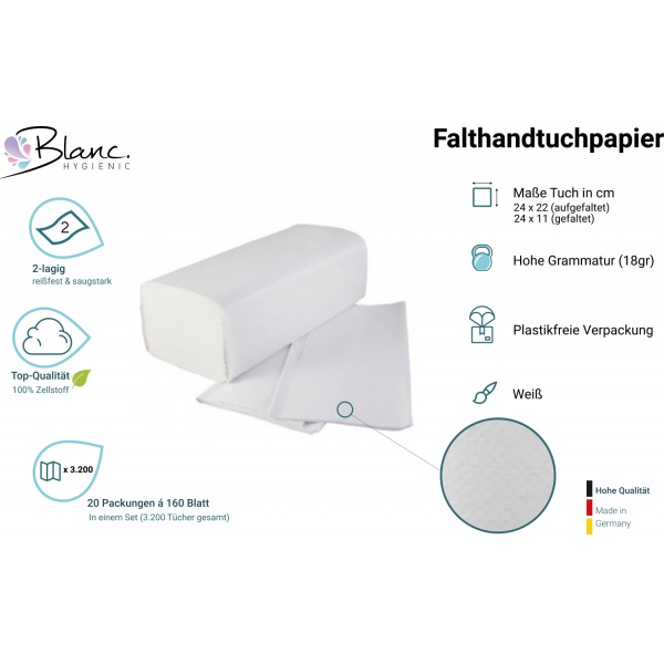 Das Falthandtuchpapier wird als praktisches Set mit insgesamt 3.200 Blatt angeboten. Jedes Blatt ist 2-lagig, weiß und besteht aus 100% Zellstoff. Mit einer Größe von 24 cm x 11 cm im gefalteten Zustand und 22 cm im aufgefalteten Zustand bietet es eine angemessene Abdeckung. Die Grammatur beträgt 18 g/m² und das Set enthält 20 Packungen mit je 160 Blatt (insgesamt 3.200 Tücher). Dieses Falthandtuchpapier eignet sich ideal für den Einsatz in verschiedenen Bereichen, sei es in Büros, Restaurants, Schulen oder anderen öffentlichen Einrichtungen, wo eine hygienische und effiziente Handtuchlösung gefragt ist. Es ermöglicht eine einfache und bequeme Handhabung und trägt zur Aufrechterhaltung einer sauberen Umgebung bei.
