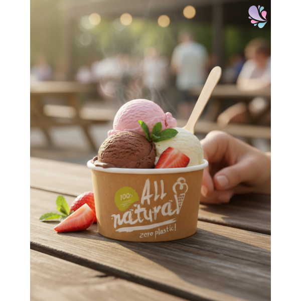 Unsere recycelbaren Eisbecher aus Papier to go mit 360 ml Fassungsvermögen bieten eine großartige nachhaltige Lösung für den Verkauf von Speiseeis und Snacks außer Haus. Mit ihrem natürlichen Material und dem Verzicht auf Kunststoffbeschichtungen unterstützen sie eine umweltfreundliche Wahl in der Gastronomie und bei Veranstaltungen, wodurch Abfall reduziert und Umweltbewusstsein gefördert wird.