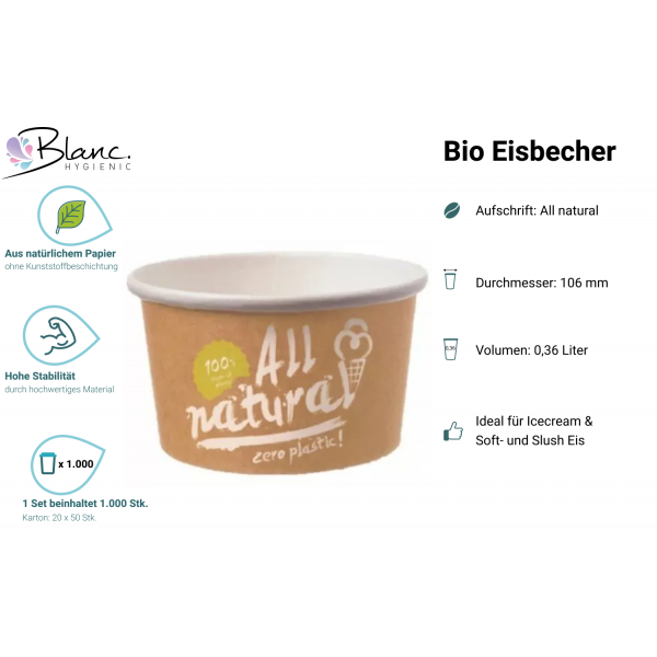 Die recycelbaren Eisbecher aus Papier to go bieten eine nachhaltige Lösung für den Verkauf von Speiseeis und anderen Snacks außer Haus. Mit einem großzügigen Füllvolumen von 360 ml pro Becher eignen sich die 1.000 Stück in einer Verpackungseinheit von 20 x 50 Stück ideal für den Einsatz in verschiedenen gastronomischen Kontexten. Mit einem Durchmesser von 106 mm und einer Höhe von 62 mm sind diese Becher auslaufsicher und bestehen aus naturbelassenem Papier. Durch ihre Herstellung ohne Kunststoff- oder Bio-Kunststoffbeschichtung und die Verwendung von Material aus FSC®-zertifizierter, nachhaltiger Forstwirtschaft tragen sie zu einer umweltbewussten Wahl bei. Der Aufdruck "ALL NATURAL" unterstreicht diese ökologische Ausrichtung.