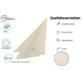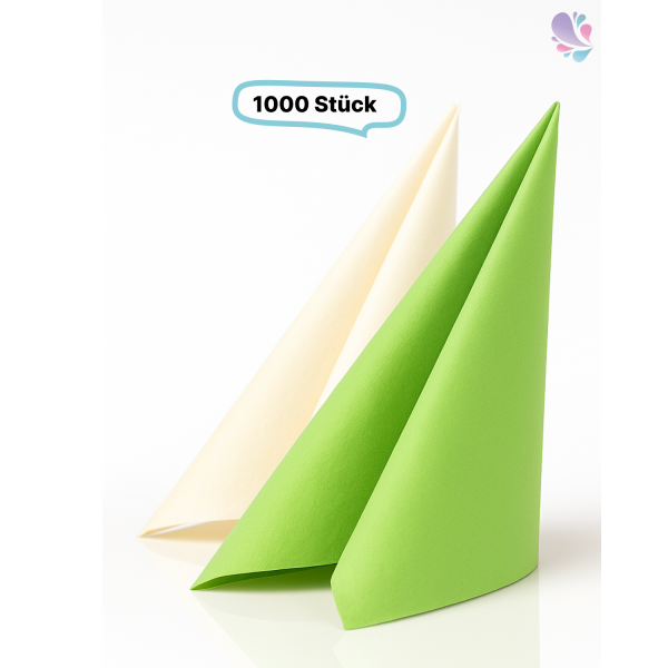 Die 33er Servietten mit 1/4 Falz und 3-lagigem Aufbau sind eine praktische Lösung für verschiedene Anlässe. Erhältlich in den Farben Creme oder Fresh Green, passen sie zu verschiedenen Dekorationsthemen. Die Verpackungseinheit (VE) von 4 x 250 Stück ermöglicht eine effiziente Nutzung und sorgt dafür, dass ausreichend Servietten zur Verfügung stehen.