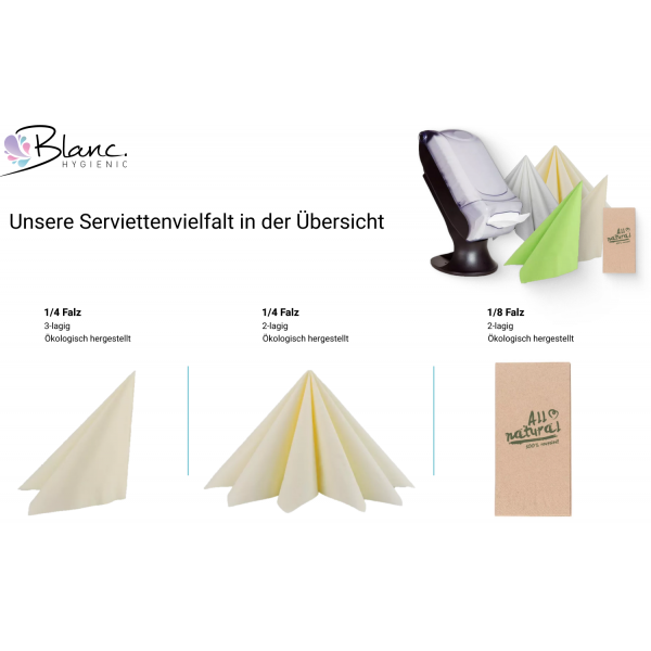 Die 3-lagigen Servietten im Format 33er mit 1/4 Falz bieten eine hochwertige und vielseitige Lösung für verschiedene Anlässe. Ob in der Gastronomie, bei Veranstaltungen oder zu Hause - diese strapazierfähigen Servietten in den Farben Creme oder Fresh Green tragen zu einer angenehmen Tischkultur und einer hygienischen Verwendung bei. Mit ihrer zuverlässigen Saugfähigkeit sind sie die ideale Wahl für eine einfache und effiziente Lösung in verschiedenen Einsatzbereichen.