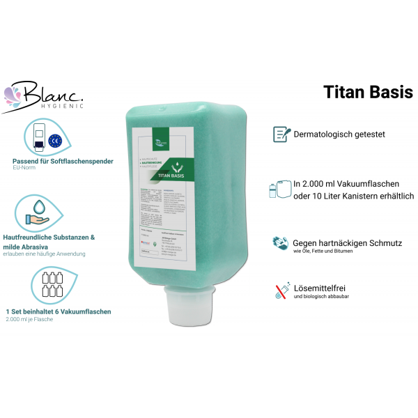 SET: Softflaschenspender 2.000 aus ABS Kunststoff + Titan Basis Handreinigungspaste 2 Vakuumflaschen à 2.000 ml zum Befüllen des Spenders