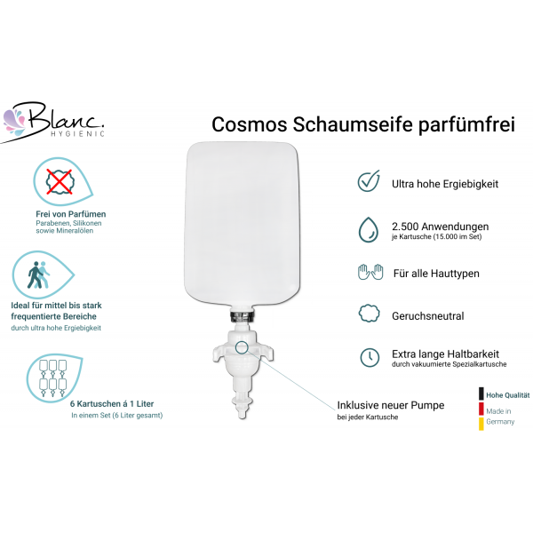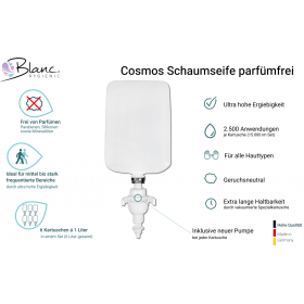 Die innovative Schaumseife parfümfrei Blanc Cosmos für den Blanc Cosmos Schaumseifenspender ist die ideale Option für die besonders schonende, pflegende und komfortable Reinigung aller Hände und Haut.