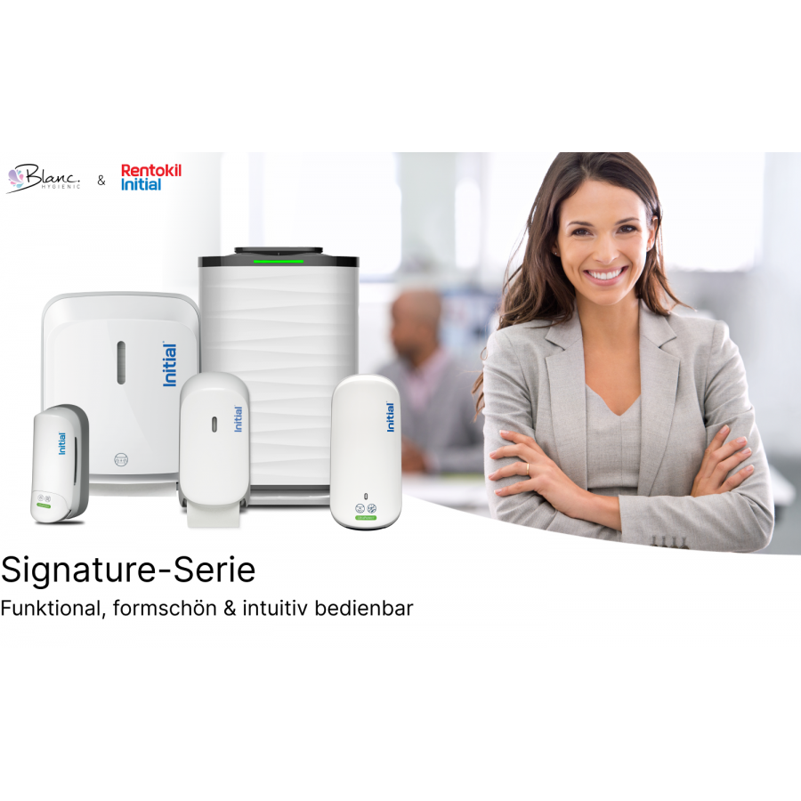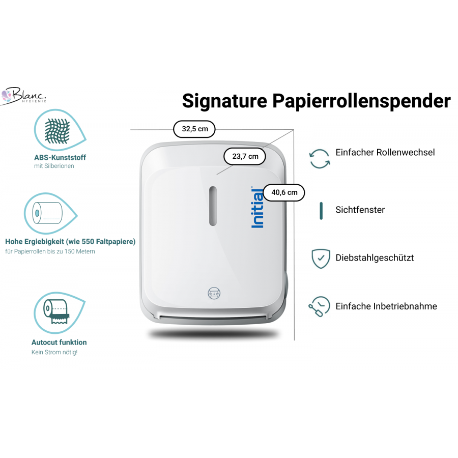 Der Papierrollenspender Signature von Initial: Schlanke Abmessungen und hoher Papiervorrat. Ideal für jeden Waschraum.