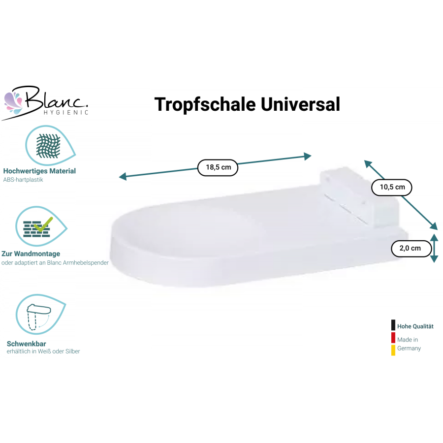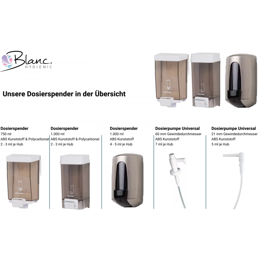 stabiler ABS Hartkunststoff 500ml oder 1.000ml befüllbar mit Desinfektion, flüssige Seife, Pflegelotion einfacher Pumpenwechsel schwenkbare, abnehmbare Abtropfschale Wandmontageplatte verschiedene Farbvarianten Made in Germany