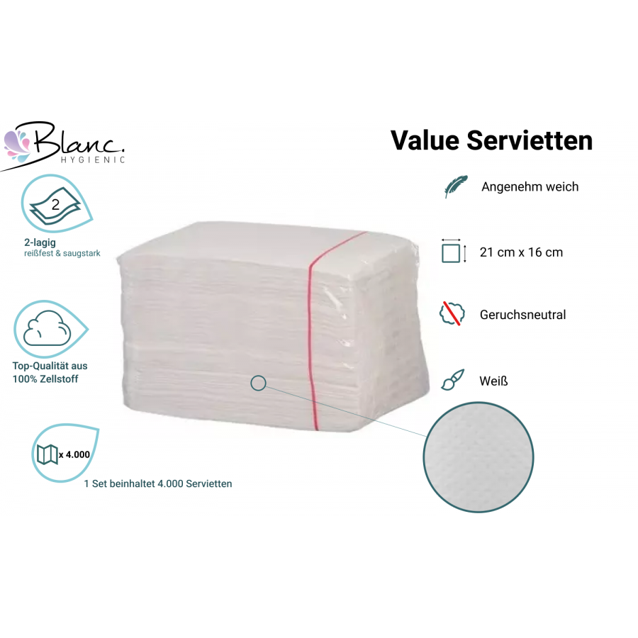 4.000 Qualitätsservietten Blanc Value Servietten SET, 2-lagig, 100% Zellstoff