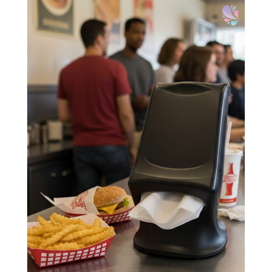 Serviettenspender ideal für Kantinen, Großküchen etc. Stehender Spender inkl. Standfuss für bis zu 600 Blatt. Standfuss abnehmbar, und somit zum Legen oder auch zur Wandmontage geeignet.