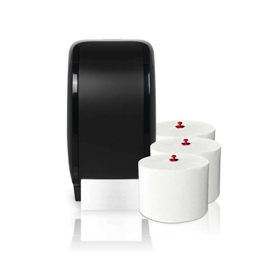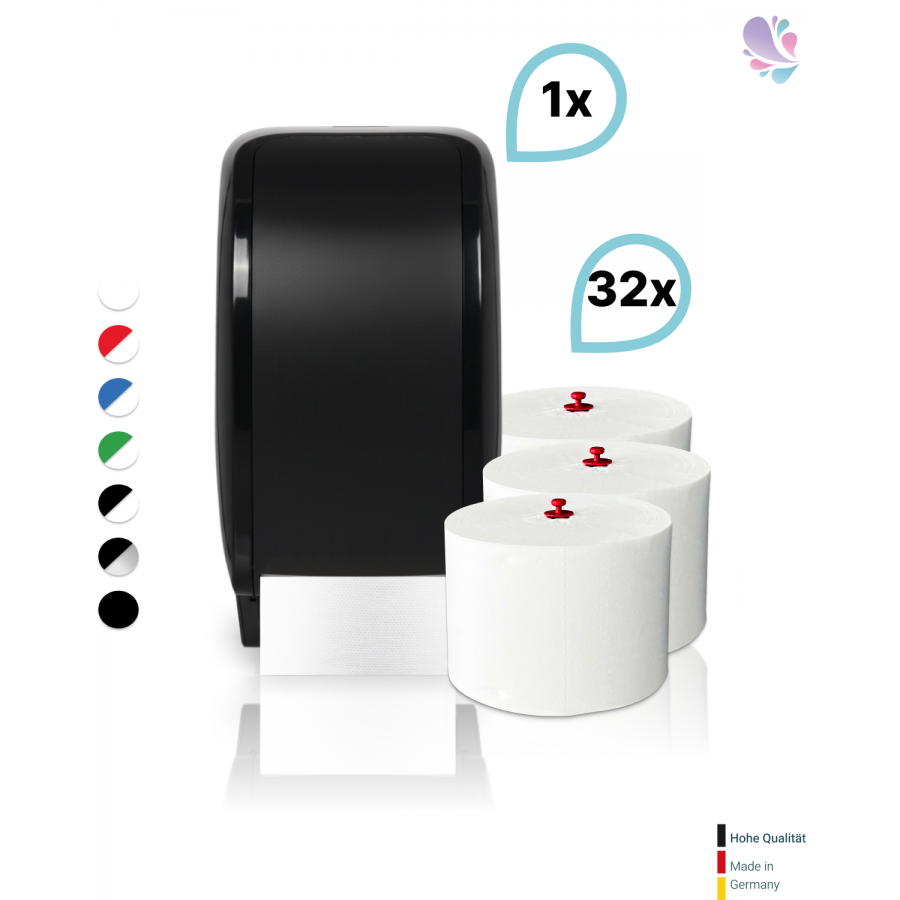 Dieses Produktset besteht aus 1 Blanc Cosmos Toilettenpapierspender + 32 passende Toilettenpapierrollen Long Life 3L